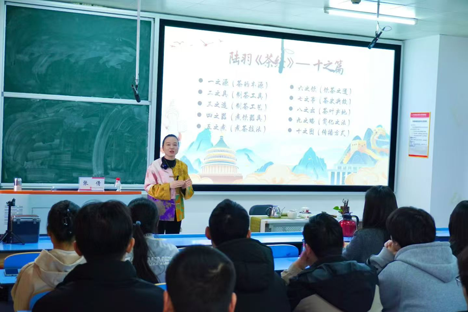 本次讲座主讲人张倩深耕茶产业近二十年,兼具理论积淀与实践经验。讲座中,张倩以“茶的起源与文化脉络”为引,从神农尝百草的传说讲到唐宋茶道的兴盛,将茶文化的发展历程融入生动案例,让同学们快速建立起对中华茶文明的认知框架。随后,张倩聚焦“现代生活茶道”核心主题,结合自身茶馆经营经验,演示了绿茶、红茶的基础冲泡手法,从茶具选择、水温控制到出汤节奏,每一步都详解要领,现场同学在导师指导下动手实践,亲身体验“温杯洁具”“高冲低斟”的茶道礼仪。