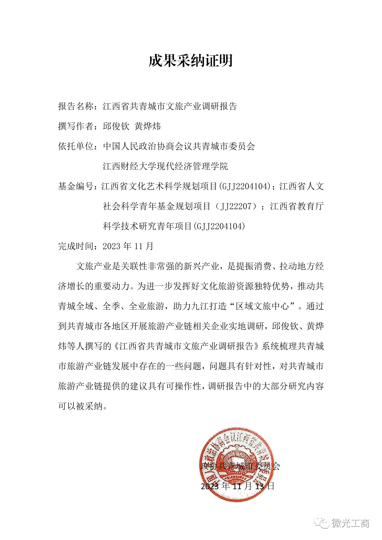 课题组如期提交调研报告《江西省共青城市文旅产业调研报告》,系统梳理了共青城市旅游产业链发展中存在的一些问题并有针对性地提出了合理化建议。为此中国人民政治协商会议共青城市委员会特此给予江西财经大学现代经济管理学院项目成果采纳证明,充分肯定了江西财经大学现代经济管理学院工商管理系副主任邱俊钦博士和会计学系黄烨炜博士的学术科研成果。