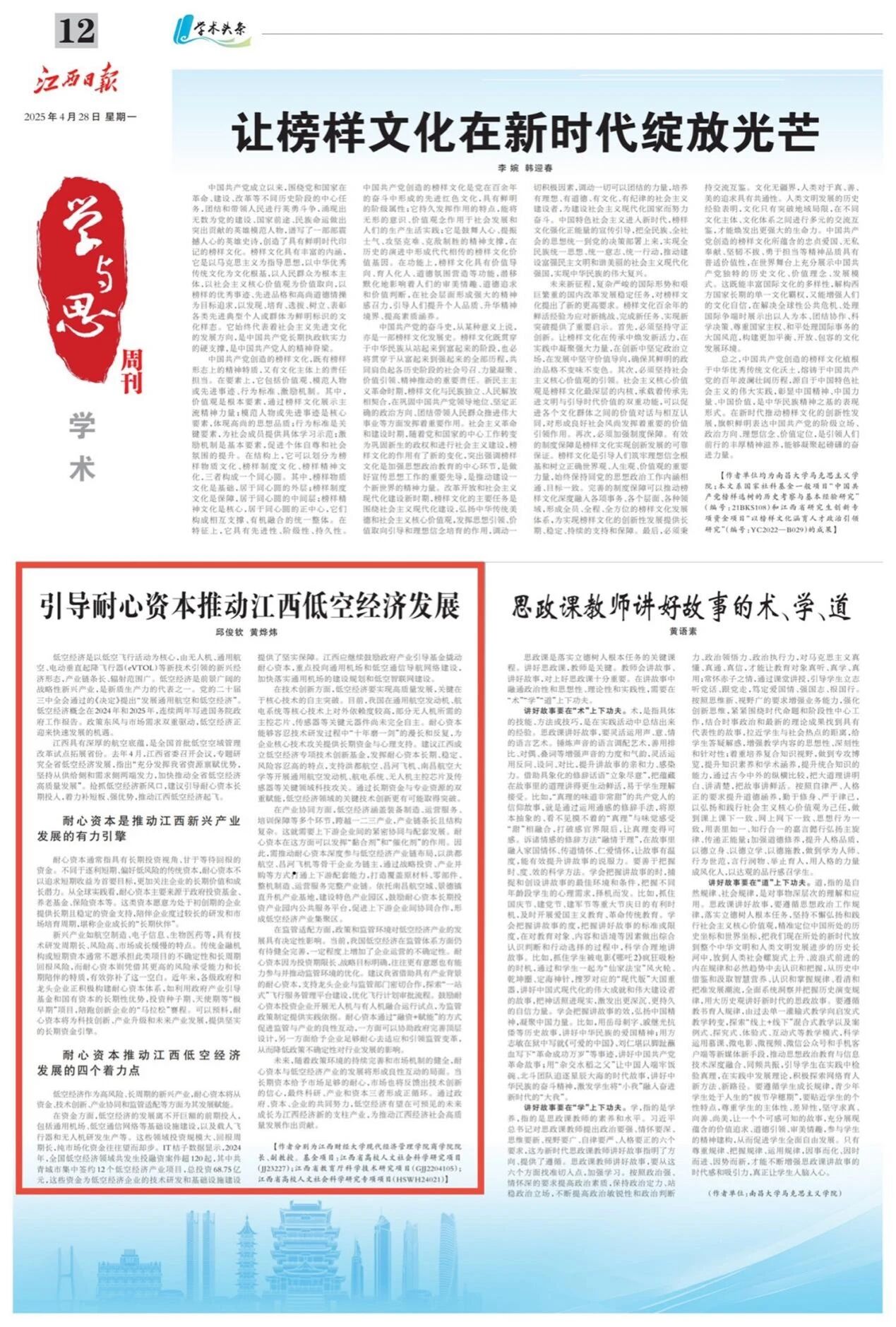 近日,《江西日报》理论版刊登江西财经大学现代经济管理学院商学院院长邱俊钦、会计学院教师黄烨炜的理论文章《引导耐心资本推动江西低空经济发展》。